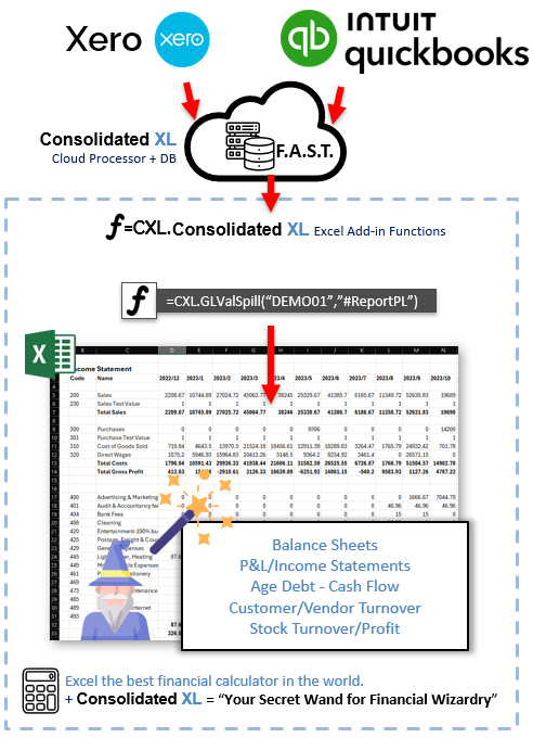 Consolidated XL provides a powerful set of simple Excel functions, used on Mac, PC and Web Excel to facilitate Consolidated Financial Reporting,
